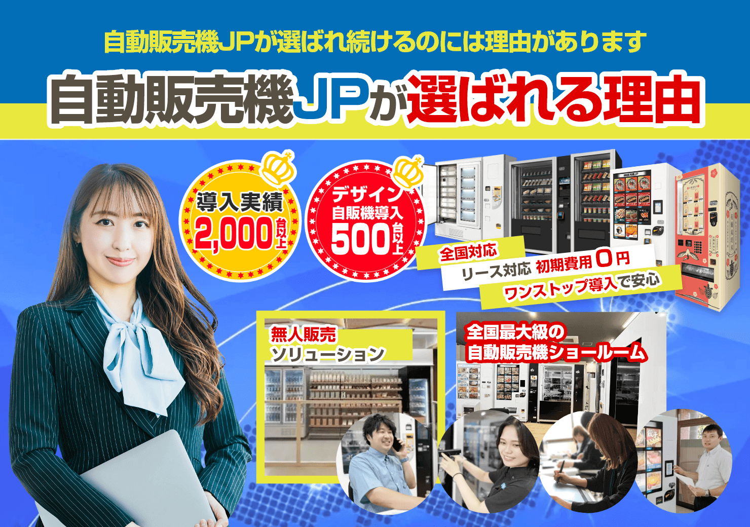 自動販売機の複数台を設置・導入なら自動販売機JP 自動販売機の複数台設置なら導入実績2,000台以上の自動販売機JPにお任せください。