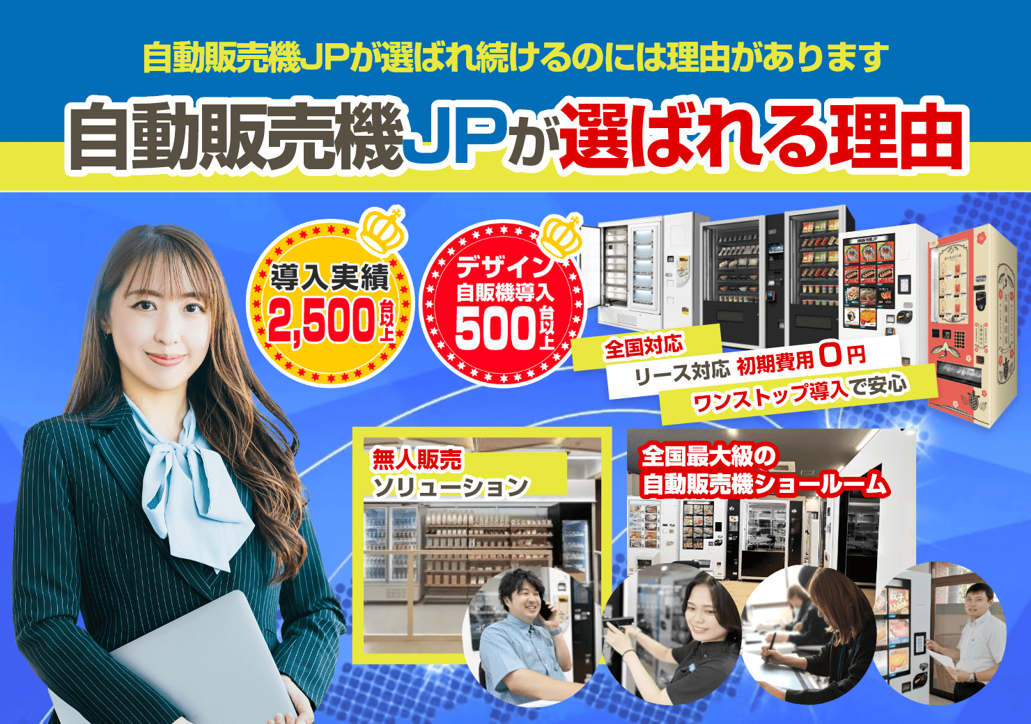 自動販売機の複数台を設置・導入なら自動販売機JP 自動販売機の複数台設置なら導入実績2,500台以上の自動販売機JPにお任せください。